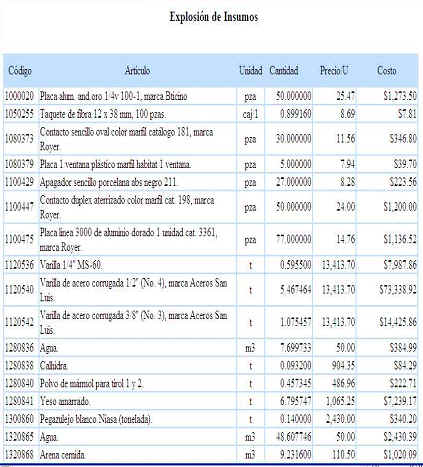 de insumos", aparecerá en otra ventana la cantidad y precio de los materiales, de